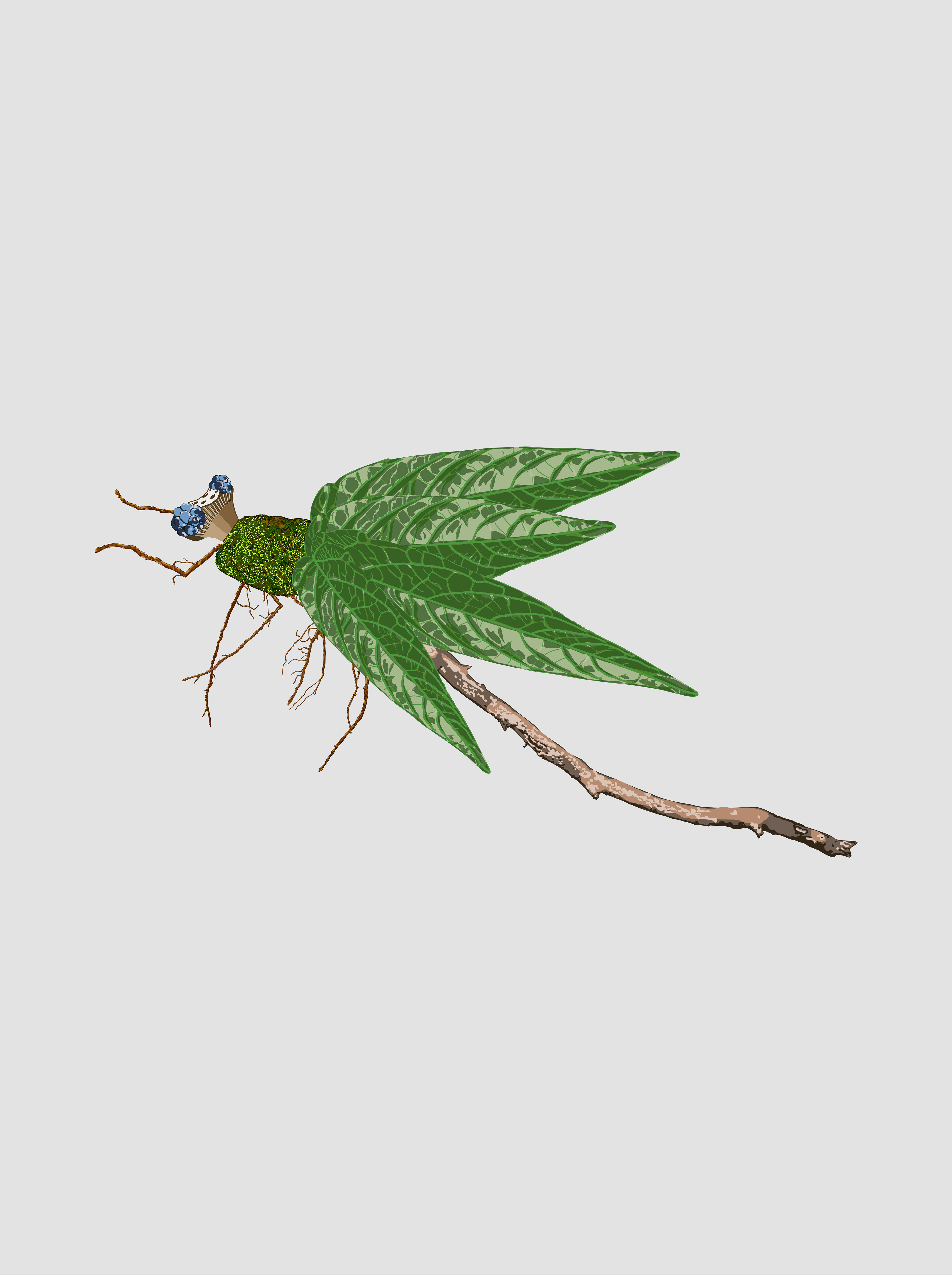 Dragonfly artwork: A composite of natural elements of sticks leaves, moss, roots, mushroom, and berries to make a re-imagined dragonfly as a plant.